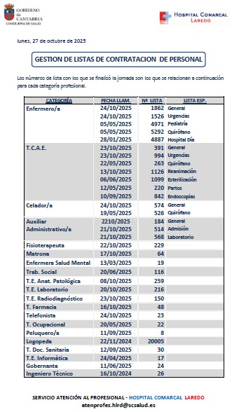 Llamamientos Bolsa de Contratación del SCS. Semana 27 de octubre de 2025