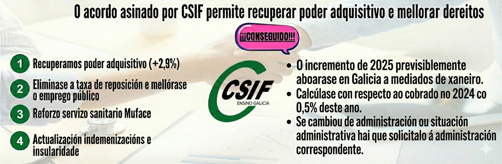 CSIF, como sindicato máis representativo da función pública, asinou co Goberno de España un acordo retributivo que recolle unha suba salarial para o ano 2025 e para os tres exercicios seguintes, así como outras medidas relacionadas coas condicións laborais do conxunto das empregadas e empregados públicos e, por extensión, do persoal docente.