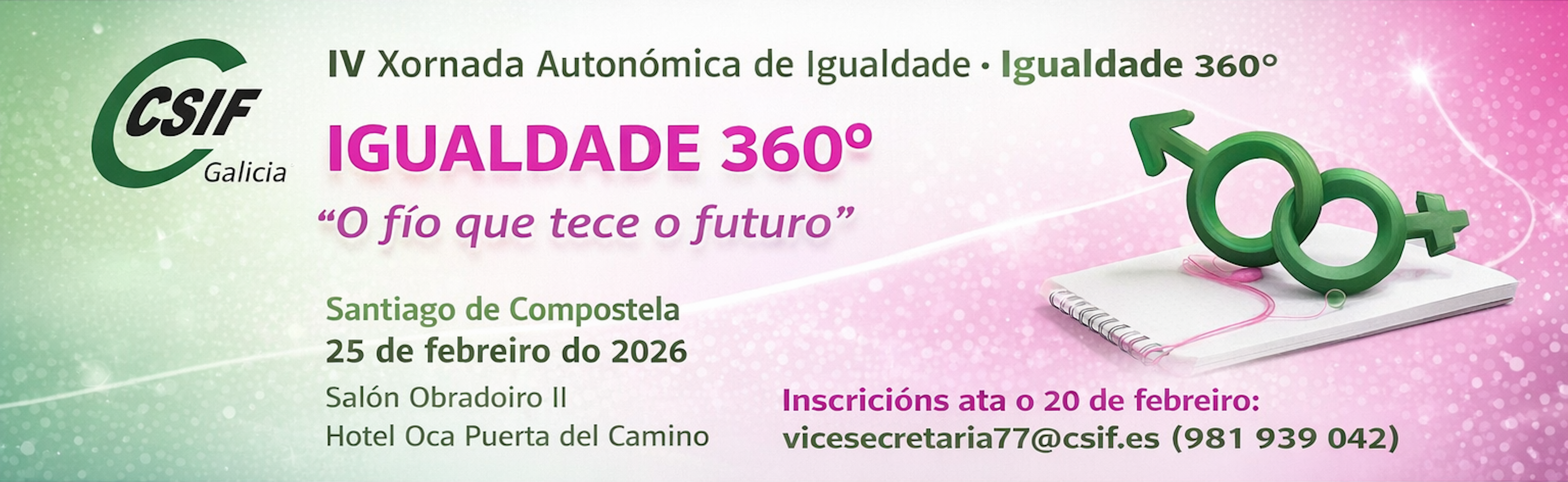 CSIF Galicia organiza a IV Xornada Autonómica de Igualdade baixo o lema “Igualdade 360º: O fío que tece o futuro”. Un encontro para reflexionar e avanzar en igualdade de xénero no ámbito laboral e no emprego público.
