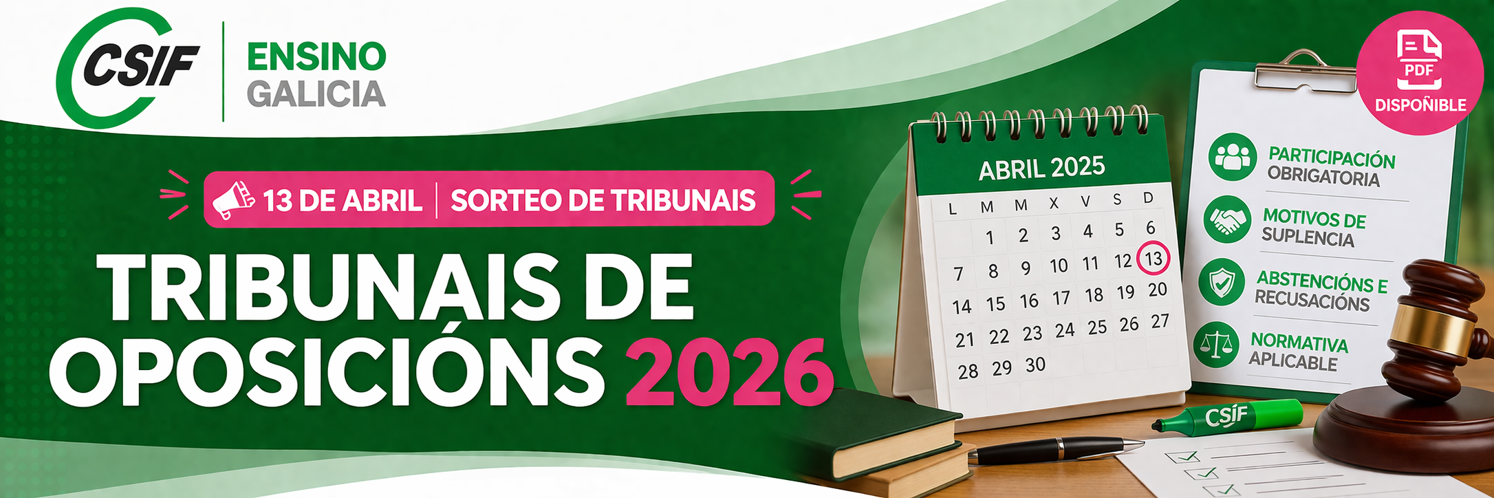 Co gallo do sorteo dos tribunais previsto para o 13 de abril, desde CSIF Ensino Galicia poñemos á vosa disposición un documento resumo para aclarar as principais dúbidas sobre a participación nos tribunais das oposicións de 2026.