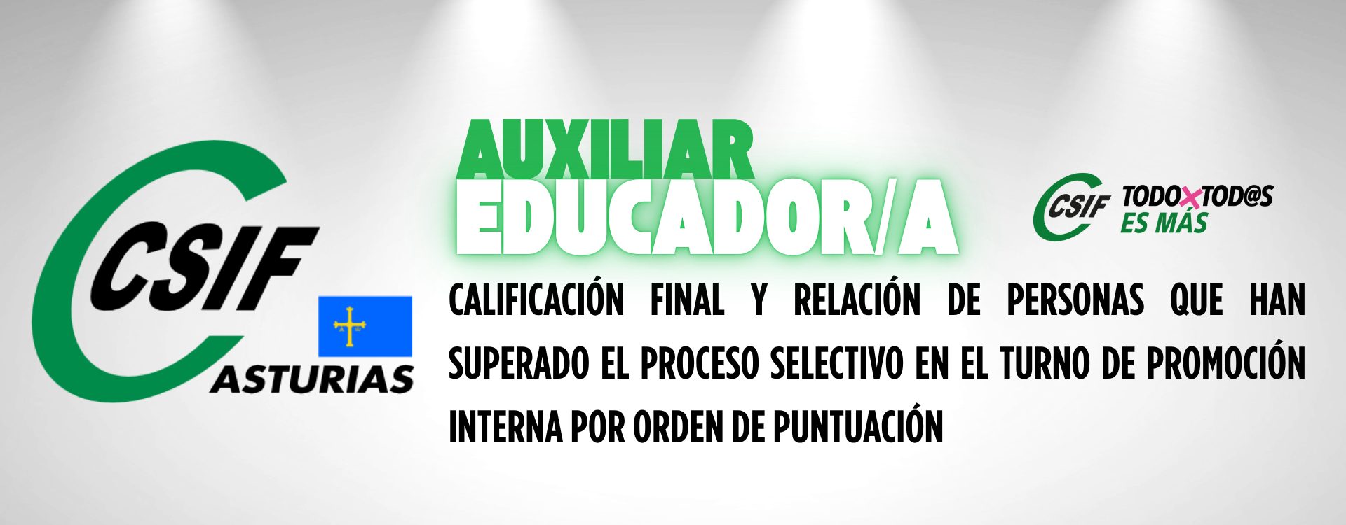 Publicada en la página https://iaap.asturias.es, en el tablón de anuncios del IAAP y del Servicio de Atención Ciudadana -SAC, el anuncio de calificación final del proceso selectivo para la provisión de 107 plazas de la categoría Auxiliar Educador/a, Grupo D, en turno de acceso libre ordinario y de promoción interna ordinaria, en régimen de personal laboral fijo, (BOPA de 23/12/2024.)