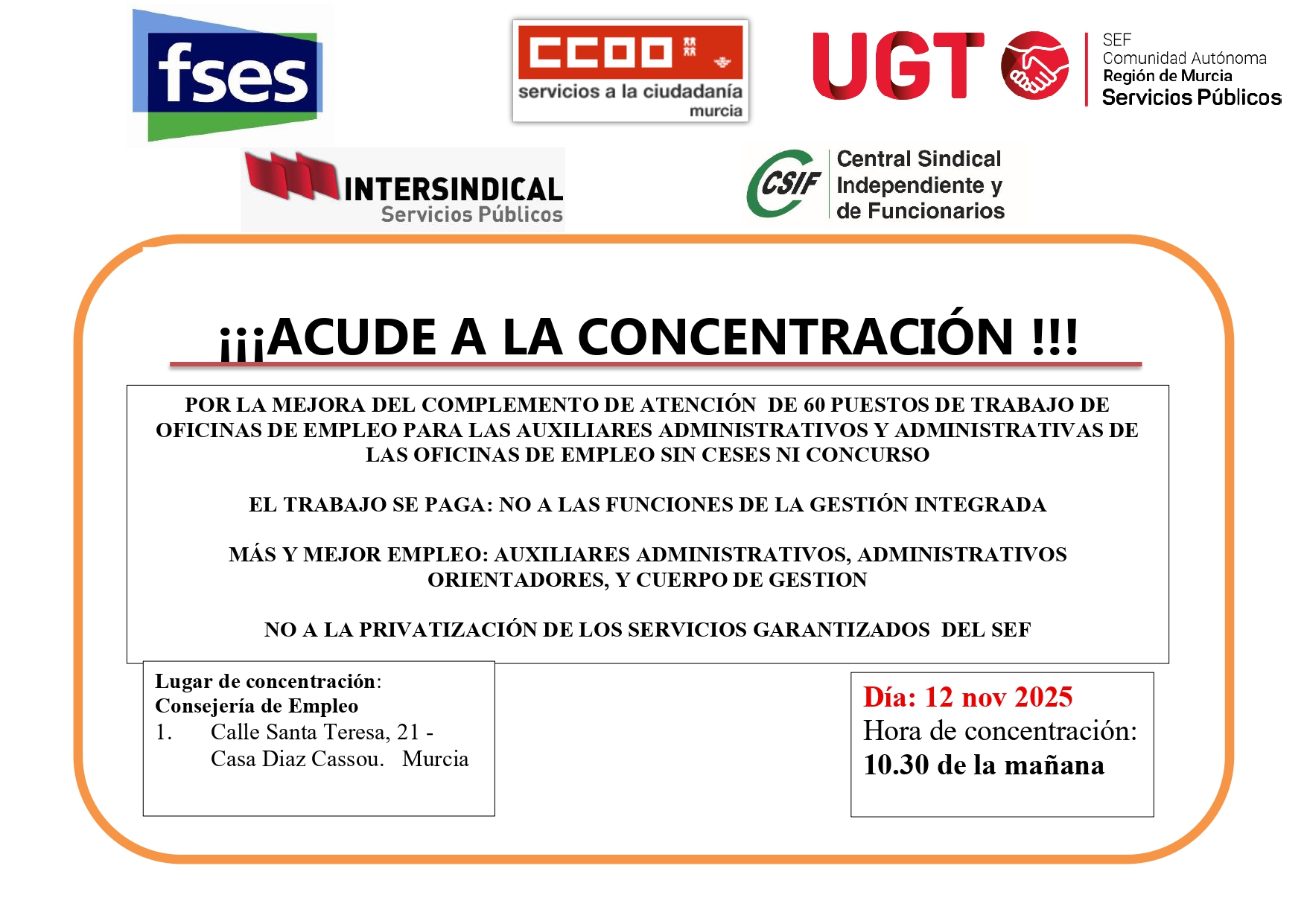 CSIF Región de Murcia, junto a Intersindical, FSES, CCOO y UGT, convoca una concentración reivindicativa ante la Consejería de Empleo para exigir la mejora del complemento de atención de 60 puestos de trabajo de auxiliares administrativos y administrativas de las oficinas de empleo del SEF, sin ceses ni concurso.