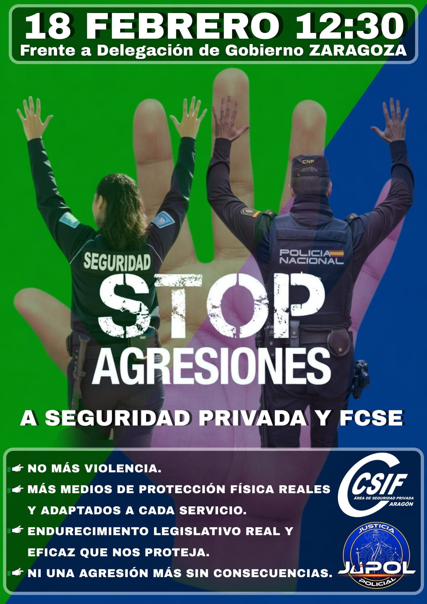 Zaragoza. (18/02/2026).- La Central Sindical Independiente y de Funcionarios (CSIF) y el sindicato policial JUPOL se han concentrado este miércoles 18 de septiembre para denunciar el aumento de agresiones sufridas por los vigilantes de seguridad y policías en su trabajo, y exigir más medidas de protección. La concentración se ha llevado a cabo este miércoles ante la Delegación del Gobierno en Zaragoza.