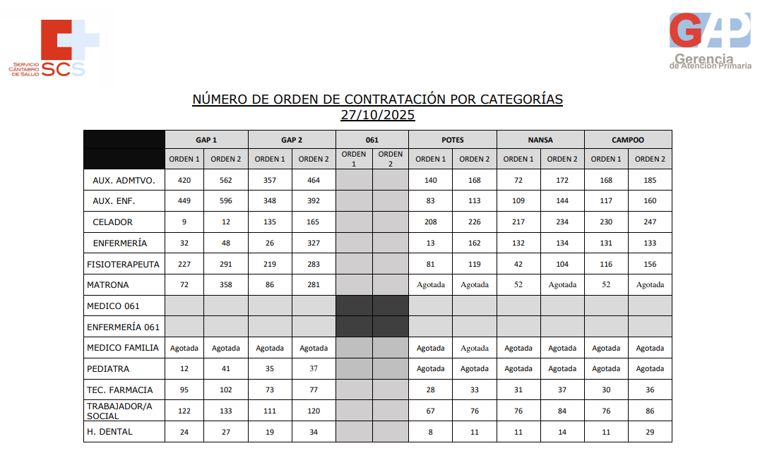 En las siguientes tablas os informamos, por categorías, del número por el que van llamando en las diferentes Gerencias del SCS para contratos eventuales