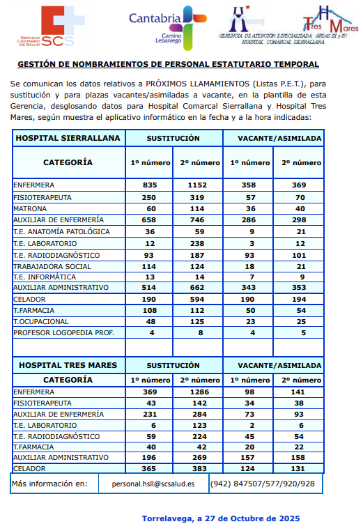 Llamamientos Bolsa de Contratación del SCS. Semana 27 de octubre de 2025