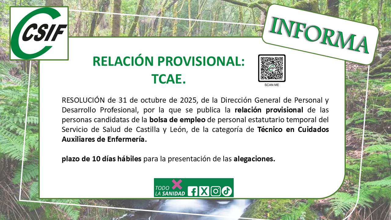 RESOLUCIÓN de 31 de octubre de 2025, de la Dirección General de Personal y Desarrollo Profesional, por la que se publica la relación provisional de las personas candidatas de la bolsa de empleo de personal estatutario temporal del Servicio de Salud de Castilla y León, de la categoría de Técnico en Cuidados Auxiliares de Enfermería.