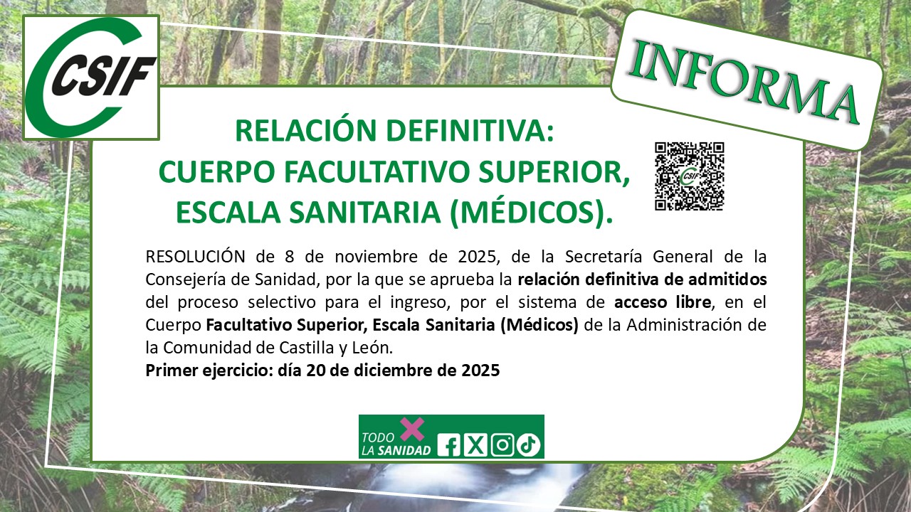 RESOLUCIÓN de 8 de noviembre de 2025, de la Secretaría General de la Consejería de Sanidad, por la que se aprueba la relación definitiva de admitidos del proceso selectivo para el ingreso, por el sistema de acceso libre, en el Cuerpo Facultativo Superior, Escala Sanitaria (Médicos) de la Administración de la Comunidad de Castilla y León, convocado por Resolución de 28 de julio de 2025, de la Viceconsejería de Administraciones Públicas y Atención al Ciudadano.