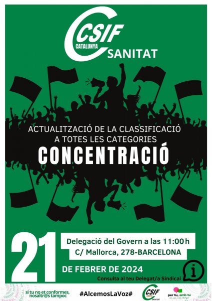 CSIF es concentra per l´ ACTUALITZACIÓ DE LA CLASSIFICACIÓ PER A TOTES LES CATEGORIES Professionals, per tots i per totes les persones treballadores del nostre sistema de salut.
