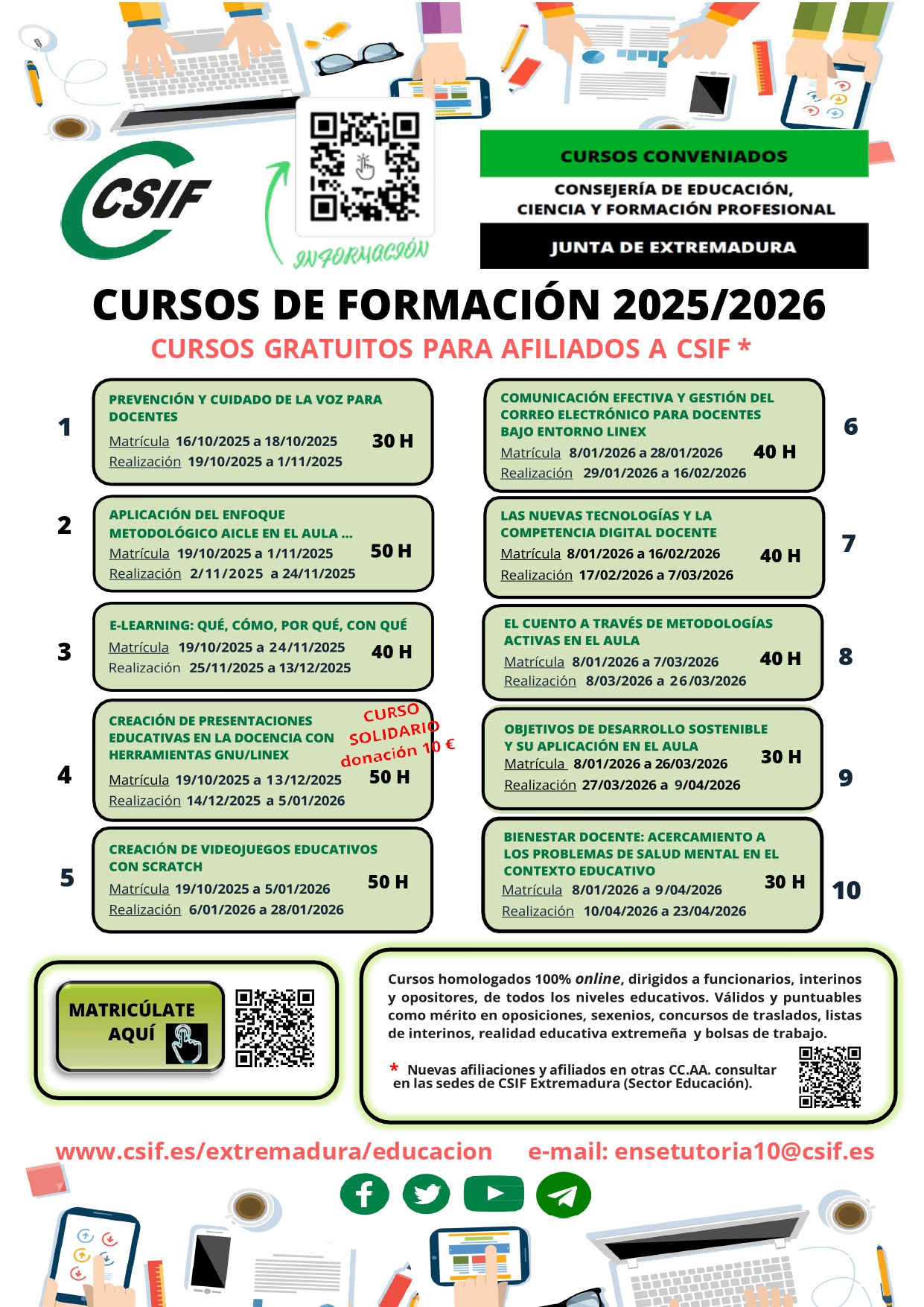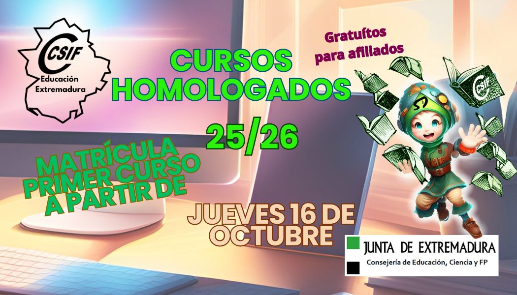 CURSOS 2025/2026: Cursos homologados por la Consejería de Educación de Extremadura gratuitos para afiliados a CSIF