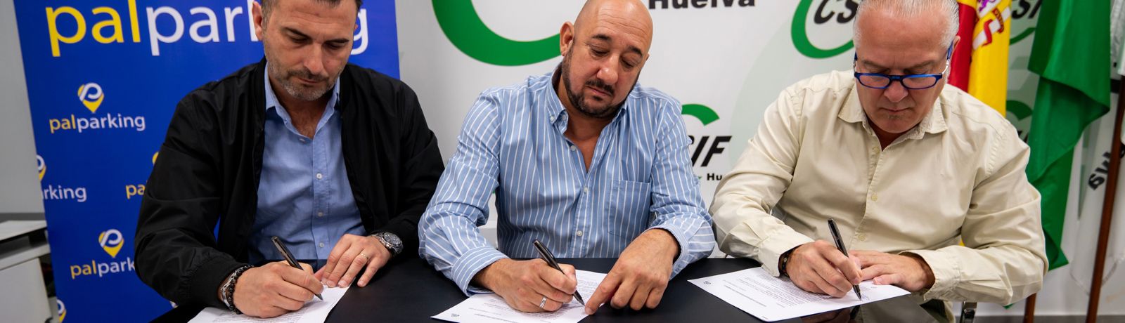 El presidente del sindicato CSIF en Huelva, Juan Manuel Quilón, los representantes de Palparking Marco Antonio Camacho y Manuel Jesús Alonso han mostrado su satisfacción tras alcanzar este acuerdo que refuerza las sinergias entre la organización sindical y la empresa.