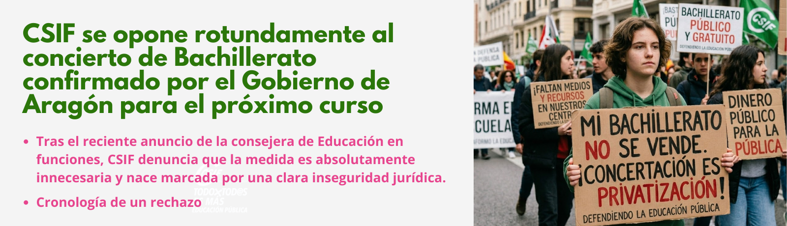 CSIF se opone rotundamente al concierto de Bachillerato confirmado por el Gobierno de Aragón para el próximo curso