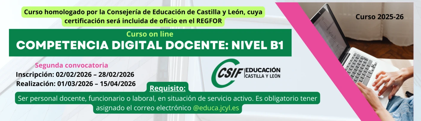 Curso: Competencia Digital Docente. Nivel B1. Todas las áreas. Homologado por la Consejería de Educación de CyL. 2ª convocatoria.