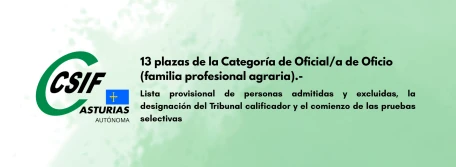 13 plazas de la Categoría de Oficial/a de Oficio (familia profesional agraria).- Lista provisional de personas admitidas y excluidas, la designación del Tribunal calificador y el comienzo de las pruebas selectivas