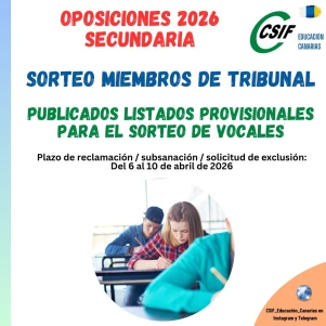 OPOSICIONES SECUNDARIA 2026. SORTEO MIEMBROS TRIBUNAL. Publicado los listados provisionales para el sorteo de vocales Secundaria y Otros Cuerpos de las especialidades convocadas
