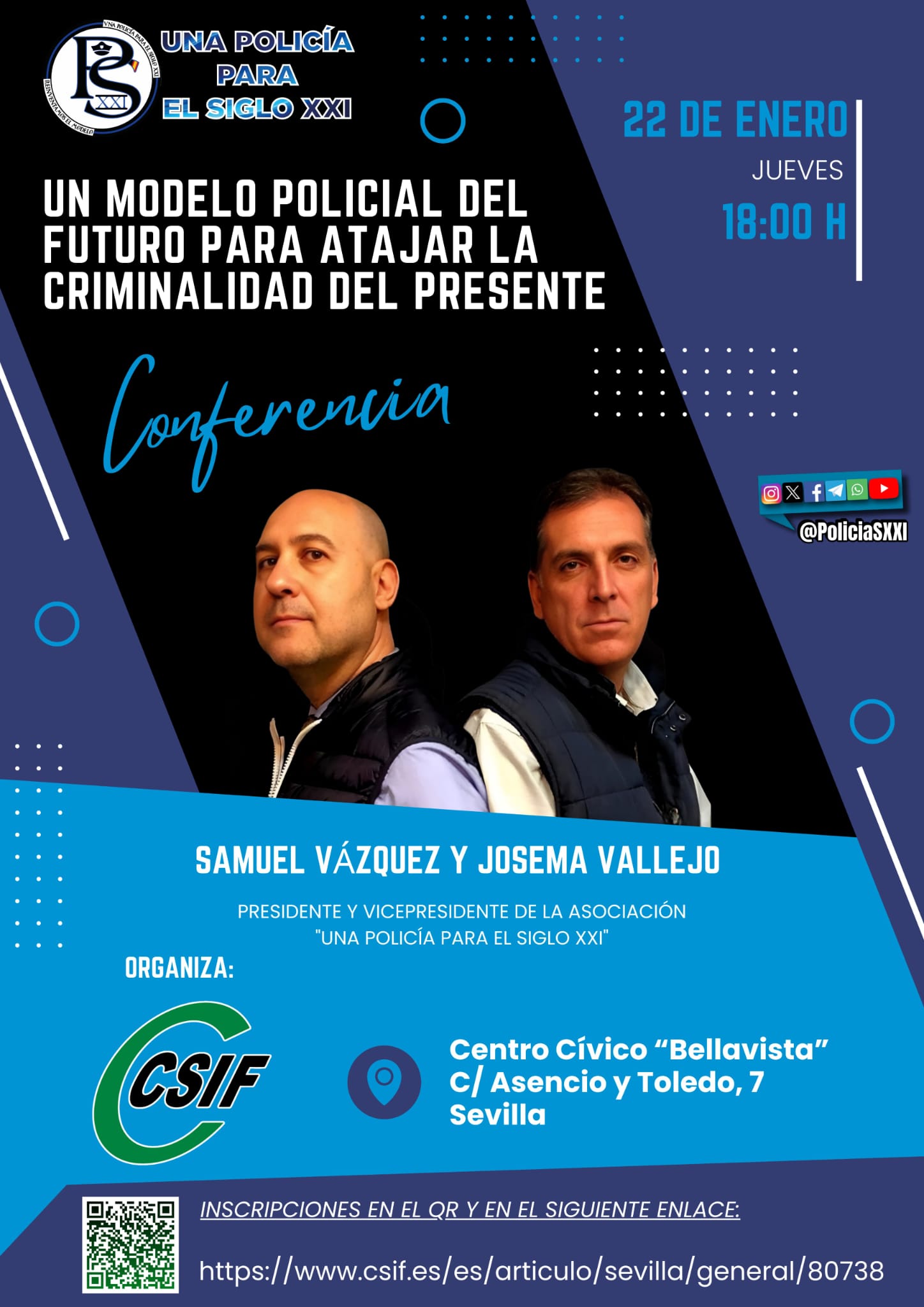 Dentro del Plan de Formación y Actualización organizado por CSIF dirigido a las plantillas de Policía Local de Andalucía, el próximo día 22 de enero se celebrará la Conferencia titulada UN MODELO POLICIAL DEL FUTURO PARA ATAJAR LA CRIMINALIDAD DEL PRESENTE, impartida por Samuel Vázquez y Josema Vallejo, Presidente y Vicepresidente respectivamente de la Asociación Una Policía para el Siglo XXI.