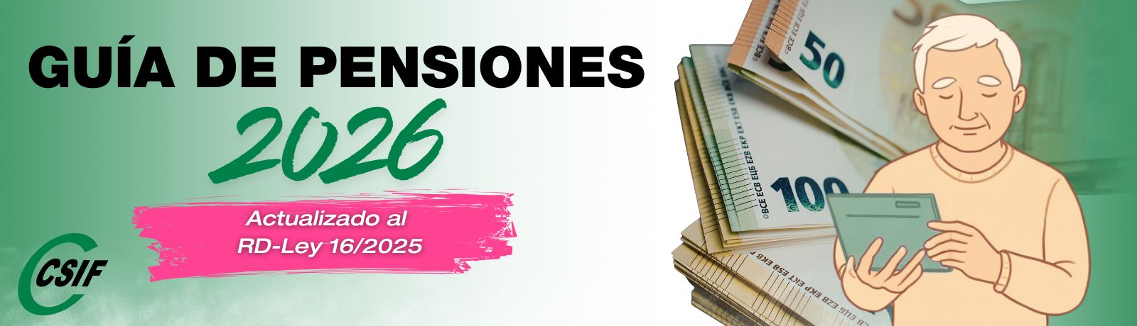 CSIF pone a tu disposición las guías actualizadas tras el Real Decreto-ley 16/2025 (BOE 24/12/2025), con la información clave sobre revalorización de pensiones y condiciones de jubilación para 2026.