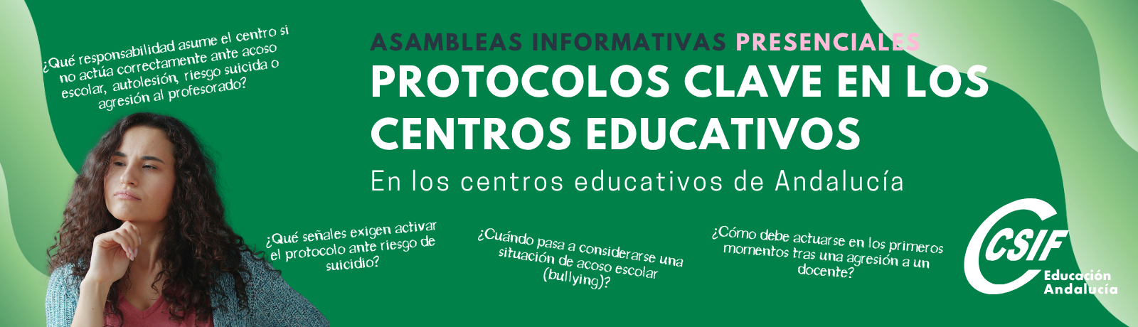 CSIF Educación Andalucía celebra una ronda de asambleas informativas para abordar de forma práctica algunos de los protocolos que generan más dudas en los centros educativos.