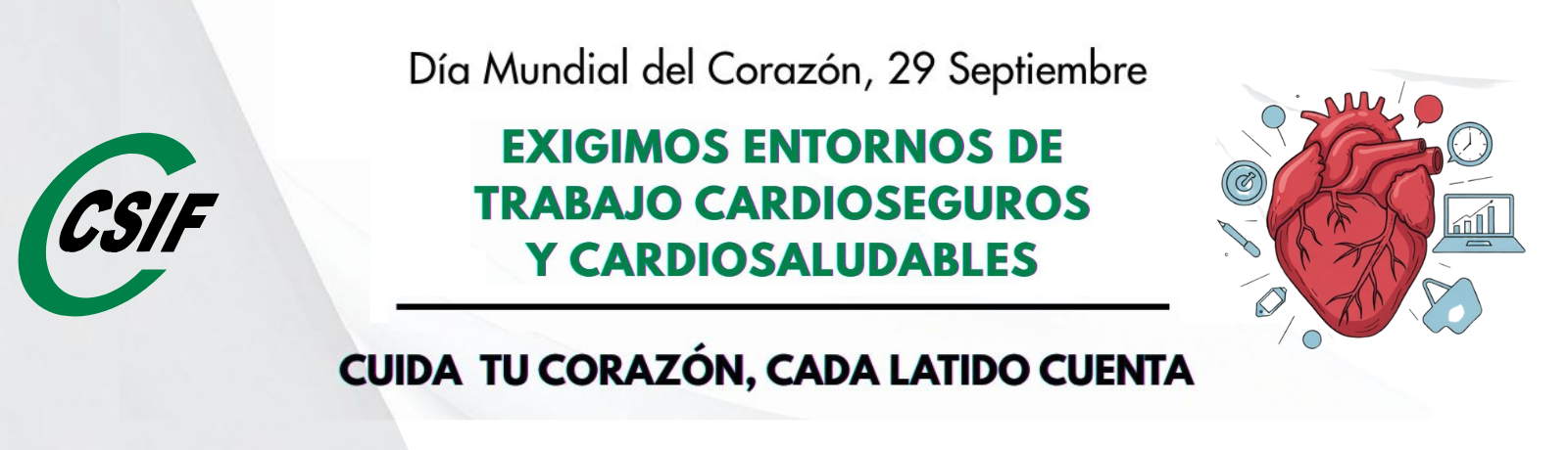 Este próximo 29 de septiembre que se conmemora el Día Mundial del Corazón, CSIF alza su voz para exigir entornos de trabajo cardio seguros y cardiosaludables, entre las reivindicaciones para reducir las cardiopatías destacan:
