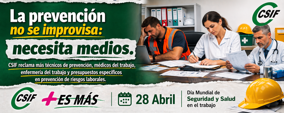 La Central Sindical Independiente y de Funcionarios (CSIF), con motivo del Día Mundial de la Seguridad y Salud en el Trabajo, quiere trasladar un mensaje claro y urgente: la salud de las/os trabajadores no puede seguir siendo una asignatura pendiente.