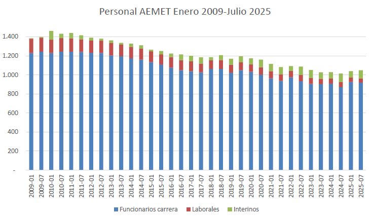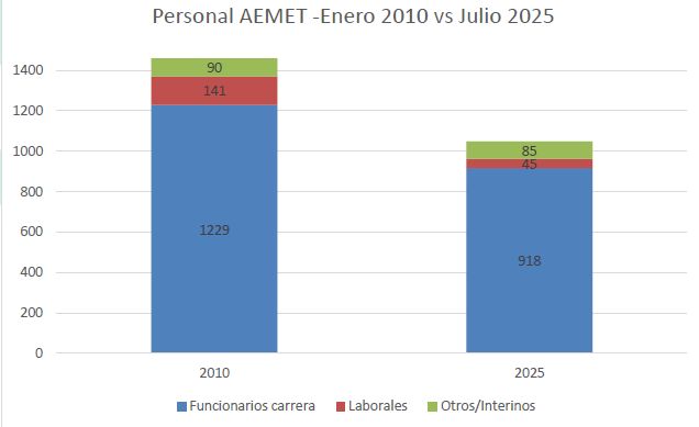 En este periodo AEMET ha perdido 412 trabajadores (entre funcionarios de carrera, interinos y laborales), más del 28%, siendo porcentualmente mucho más acusado en personal laboral (-68%) que en funcionario (-25%)