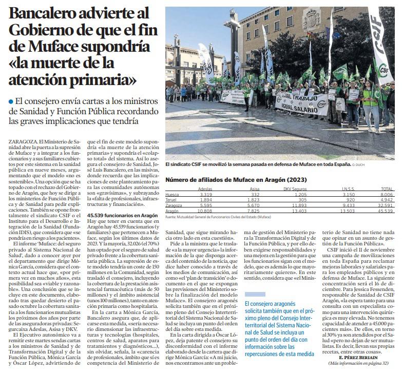 CSIF denuncia que la desaparición de *MUFACE* colapsaría el sistema sanitario aragonés.