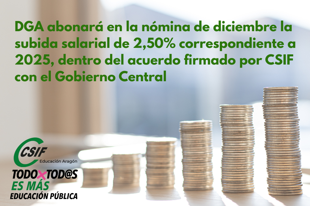 DGA abonará en la nómina de diciembre la subida salarial de 2,50% correspondiente a 2025, dentro del acuerdo firmado por CSIF con el Gobierno Central