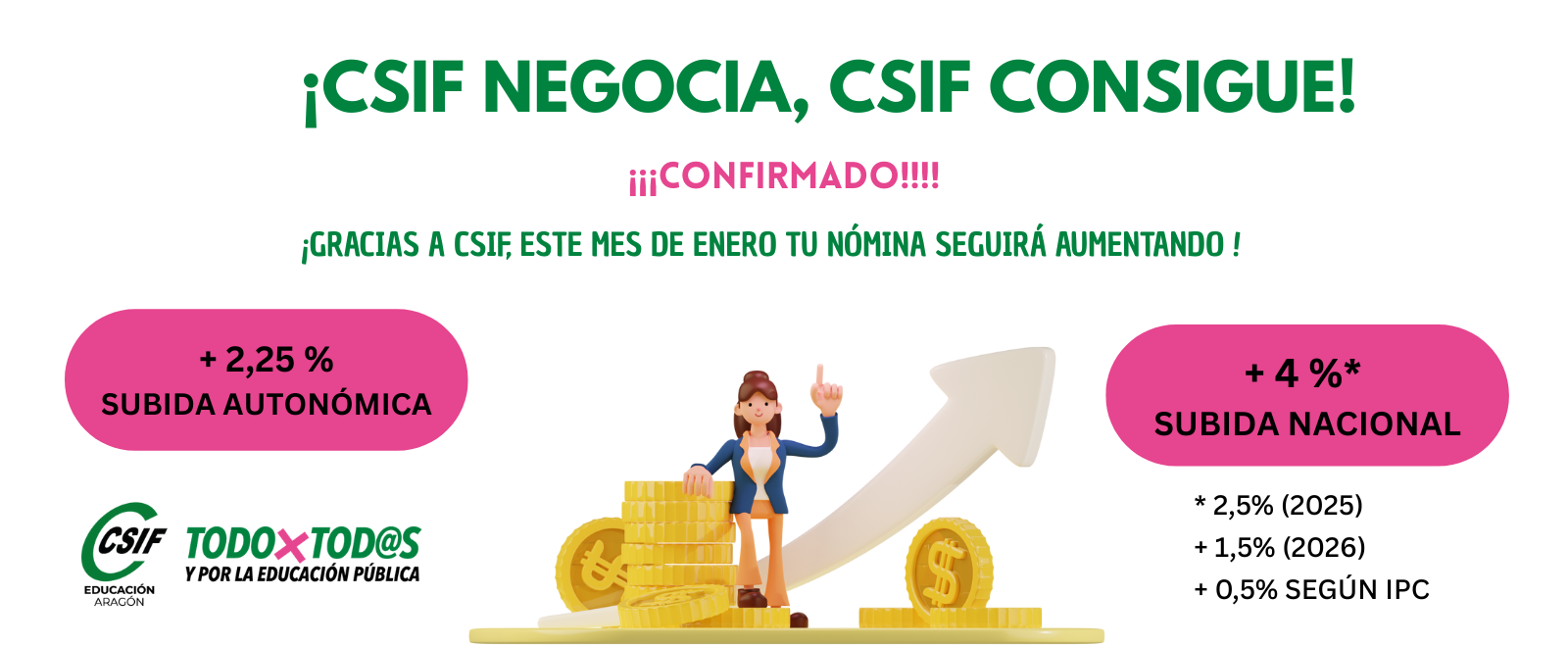 Este aumento retributivo se produce por la aplicación conjunta de la subida salarial de ámbito nacional y la subida autonómica, derivada del acuerdo firmado en Aragón únicamente por CSIF.