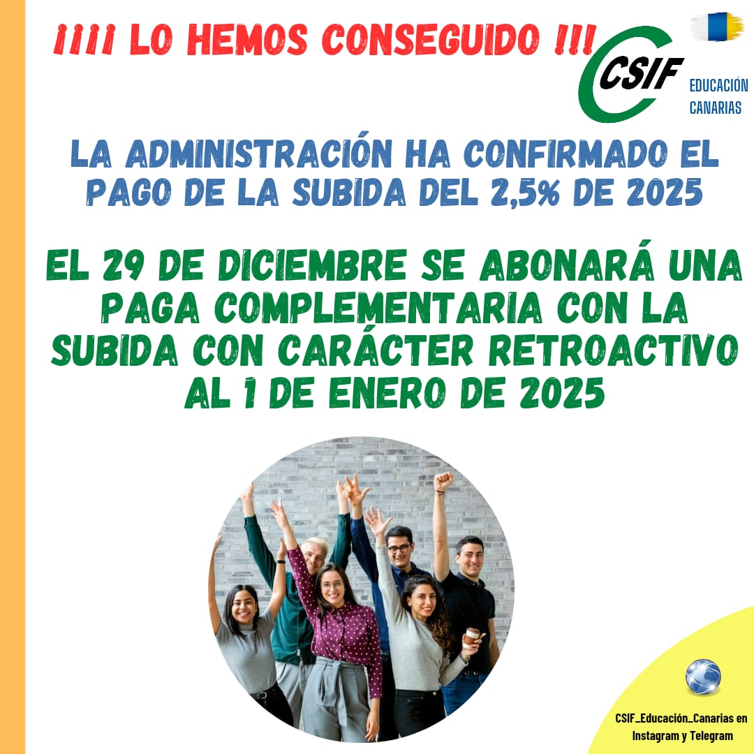 LA ADMINISTRACIÓN CONFIRMA EL PAGO DE LA SUBIDA SALARIAL DEL 2.5% PARA TODO 2025 CONSEGUIDO POR CSIF.