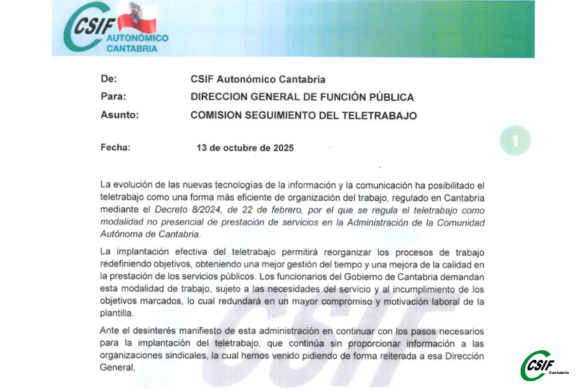 CSIF Cantabria Autonómico presenta un escrito dirigido a la Dirección General de Función Pública reclamando seriedad y transparencia en la implantación del teletrabajo tras el silencio prolongado de la Consejería de Presidencia
