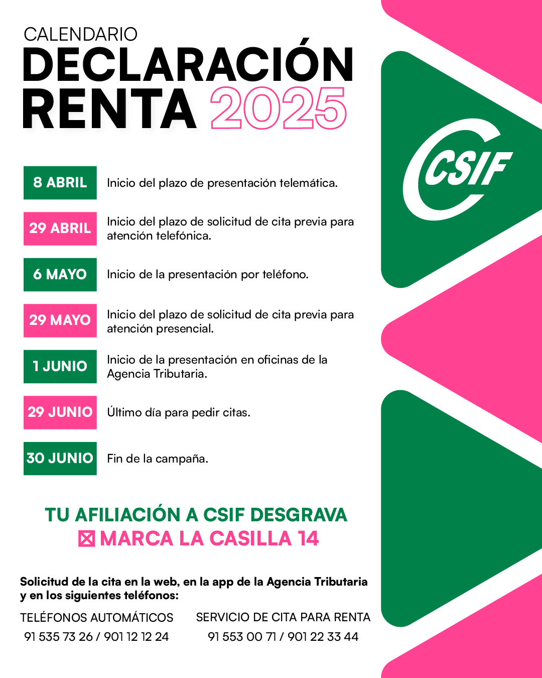 Desde CSIF, te informamos del calendario con las fechas que debes tener en cuenta y te recordamos que, como afiliad@ a CSIF Cantabria, puedes deducir la cuota de afiliación sindical en la declaración anual de la Renta, tal como se contempla en la Ley de IRPF.