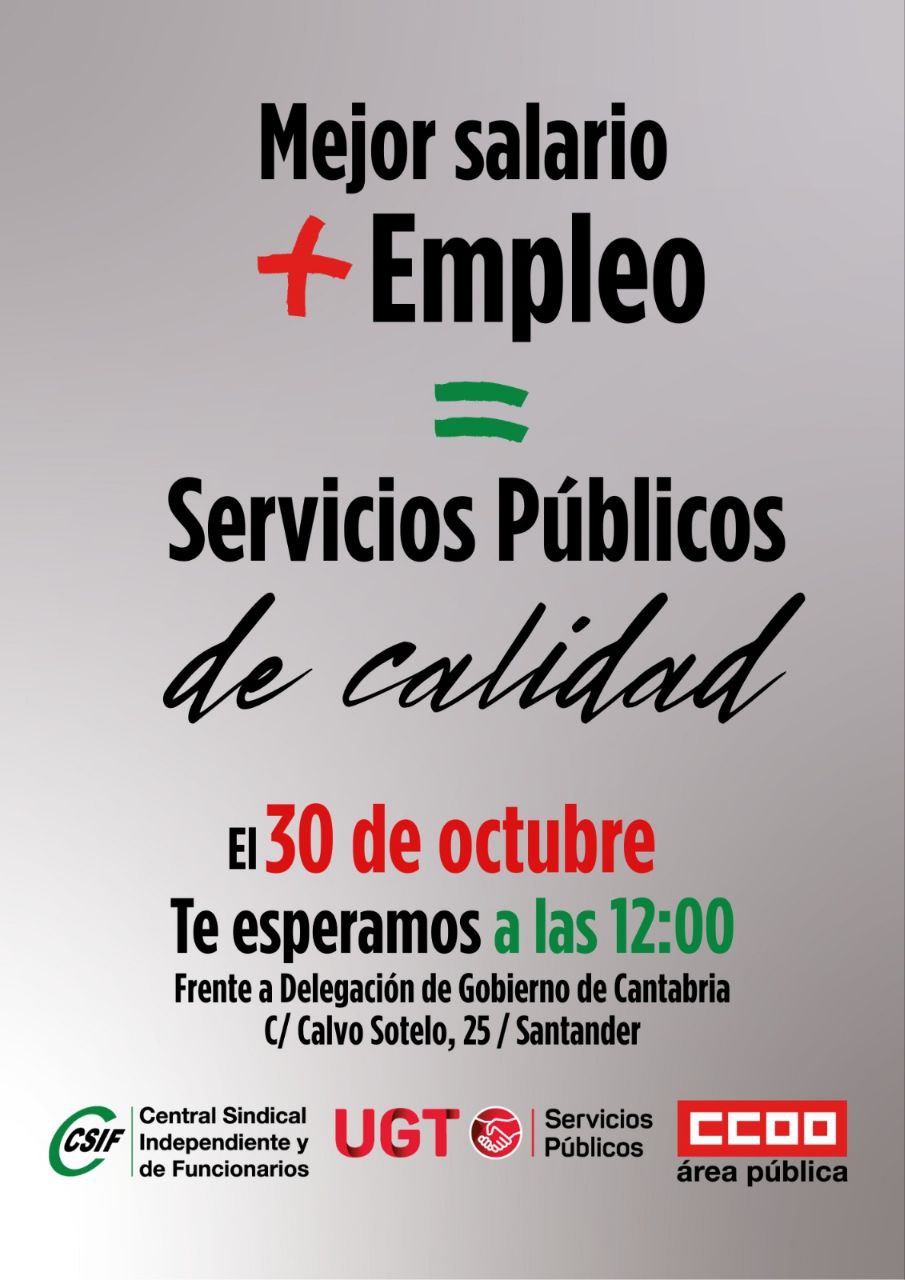 En Cantabria, la concentración se celebrará a las 12.00 horas frente a la sede de la Delegación del Gobierno, en la calle Calvo Sotelo nº 25 de Santander, en el marco de las protestas convocadas en todo el país por unos servicios públicos de calidad, incrementos salariales, más empleo y mejora de las condiciones laborales para los más de tres millones y medio de empleadas y empleados públicos.