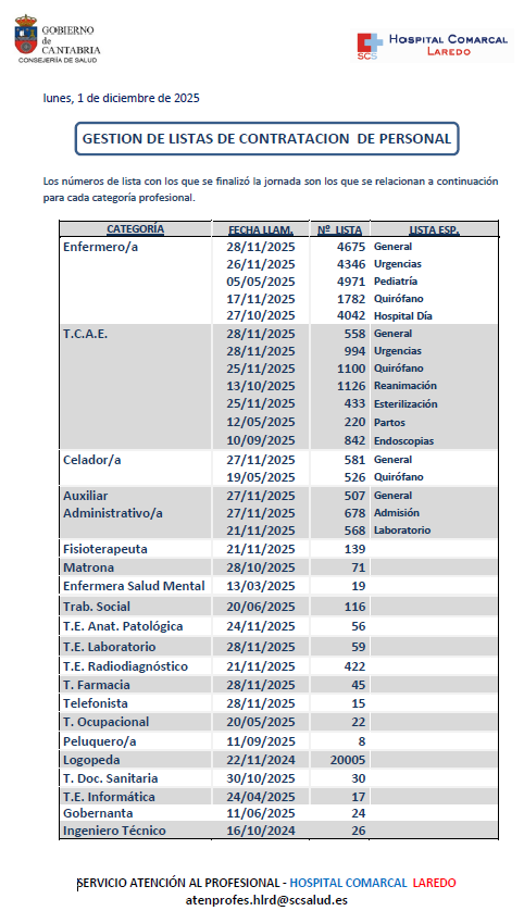 Llamamientos Bolsa de Contratación del SCS. Semana 1 de diciembre de 2025