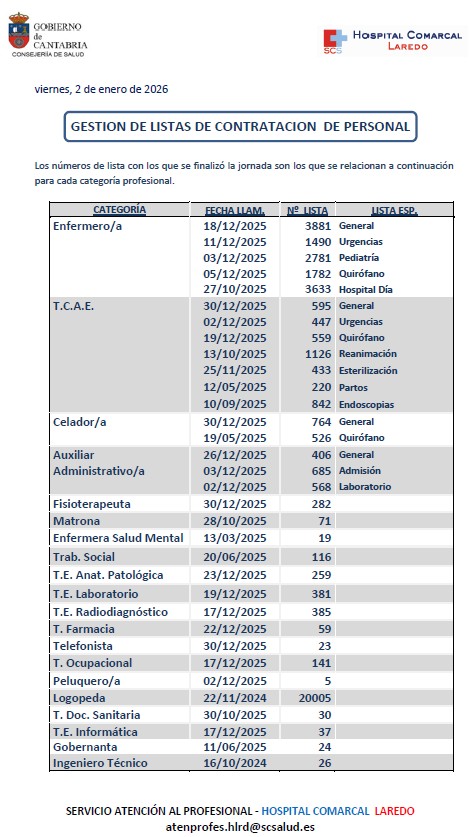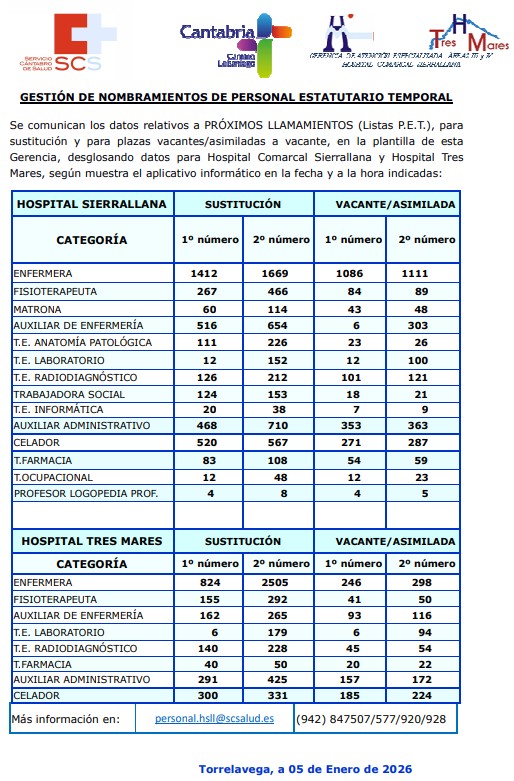 Llamamientos Bolsa de Contratación del SCS. Semana 5 de enero de 2026