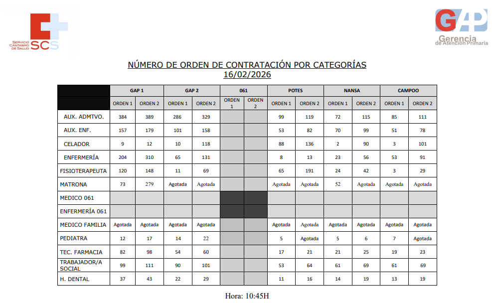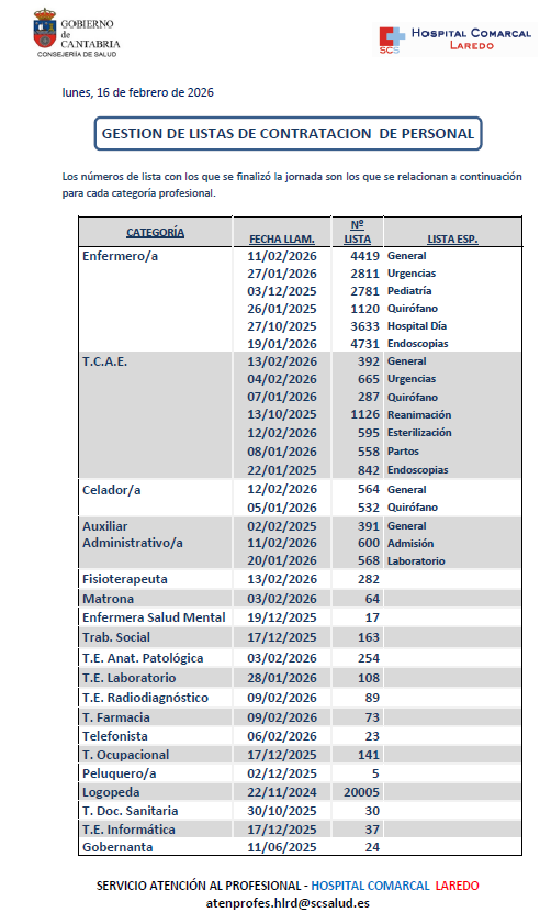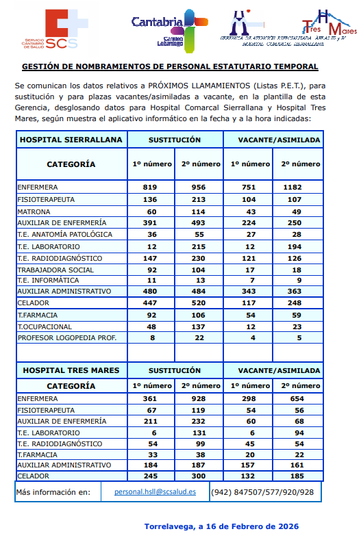 Llamamientos Bolsa de Contratación del SCS. Semana 16 de febrero de 2026