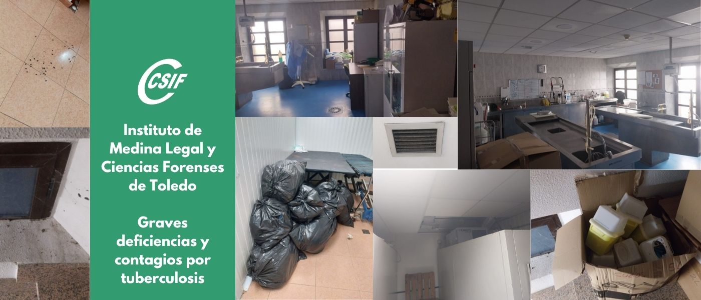 La Central Sindical Independiente y de Funcionarios (CSIF) ha interpuesto denuncia ante Inspección de Trabajo y ha acudido al Servicio de Salud y Prevención de Riesgos Laborales de la Gerencia Territorial de Justicia de Castilla-La Mancha para mostrar la situación de Servicio de Patología del Instituto de Medicina Legal y Ciencias Forenses de Toledo, cuyas instalaciones no reúnen las condiciones mínimas de seguridad necesarias para la realización de autopsias y donde incluso se han producido cinco positivos por tuberculosis.