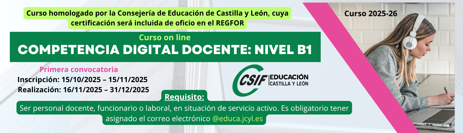 -  Ser personal docente, funcionario o laboral, en situación de servicio activo o en situación asimilada, prestando sus servicios en centros docentes de enseñanza no universitaria dependientes de la Consejería de Educación de la Comunidad de Castilla y León. Es obligatorio tener asignado el correo electrónico @educa.jcyl.es