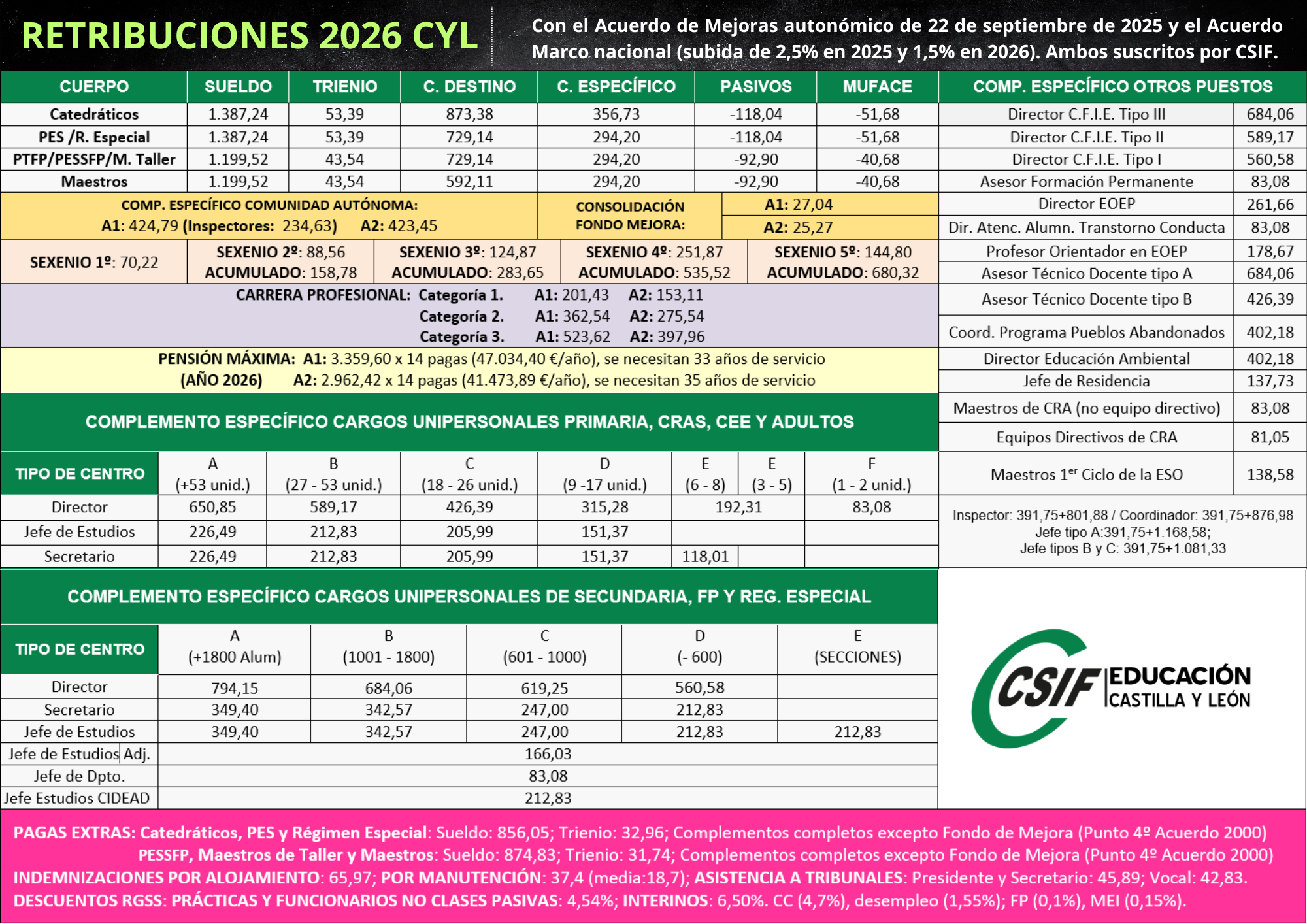 CSIF INFORMA: Cuadro de retribuciones docentes vigentes en CyL desde el 1 de enero de 2026.