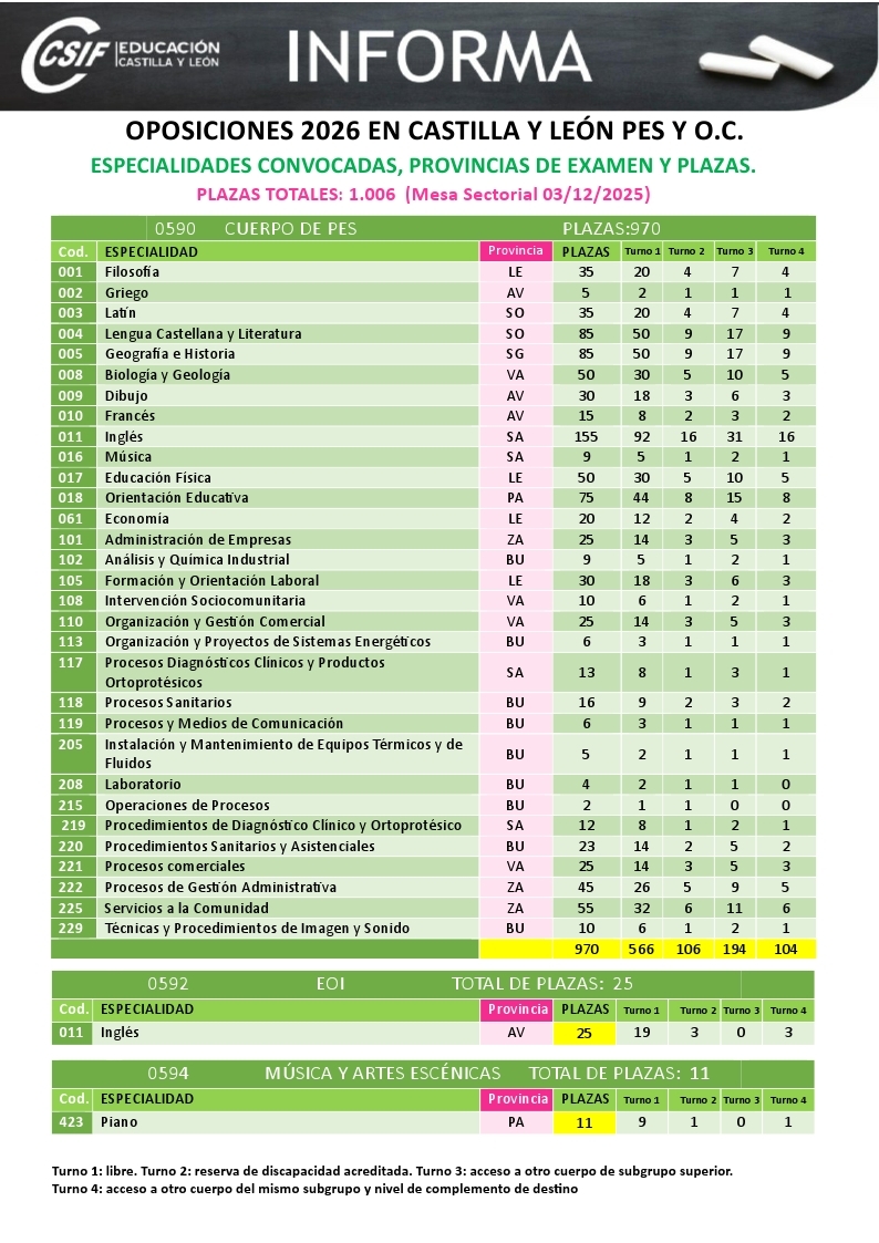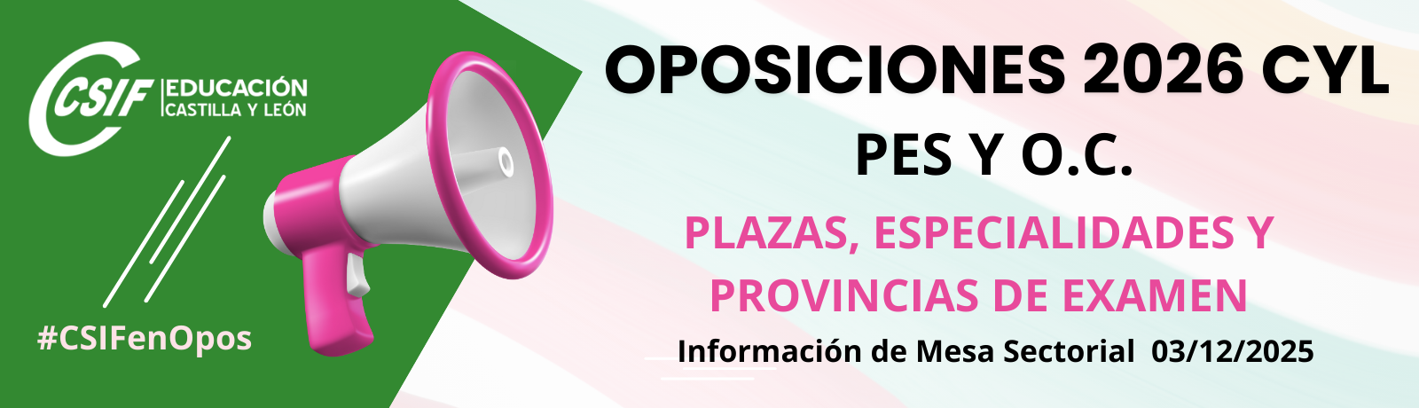CSIF INFORMA. Oposiciones de reposición de PES y O.C. 2026 en CyL. Plazas, especialidades y provincias de examen.