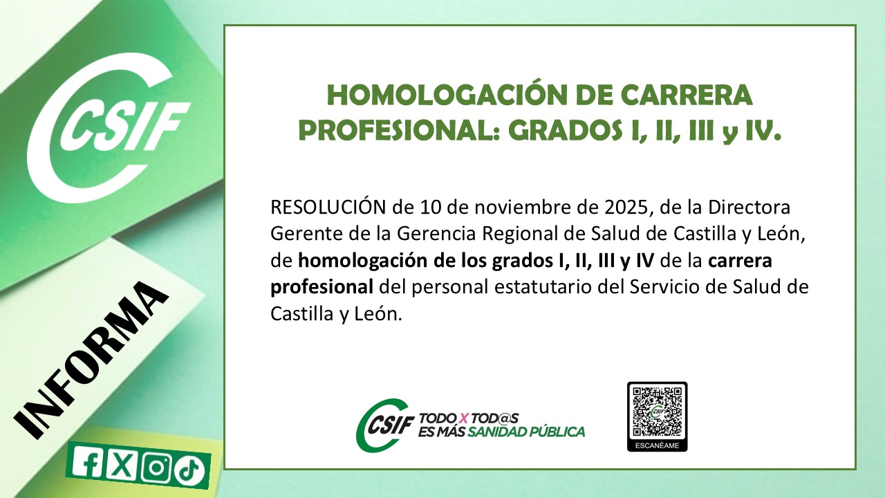 RESOLUCIÓN de 10 de noviembre de 2025, de la Directora Gerente de la Gerencia Regional de Salud de Castilla y León, de homologación de los grados I, II, III y IV de la carrera profesional del personal estatutario del Servicio de Salud de Castilla y León.