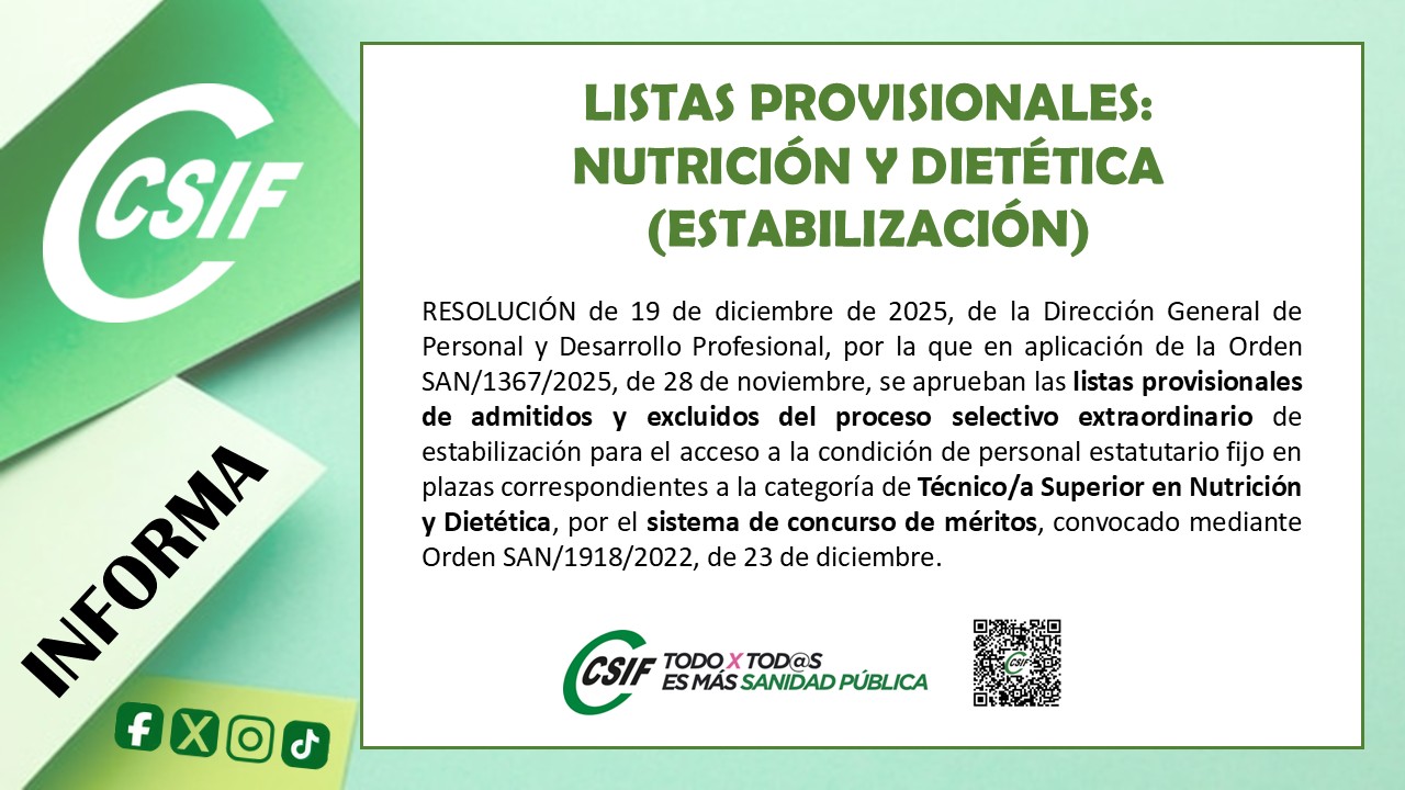 RESOLUCIÓN de 19 de diciembre de 2025, de la Dirección General de Personal y Desarrollo Profesional, por la que en aplicación de la Orden SAN/1367/2025, de 28 de noviembre, se aprueban las listas provisionales de admitidos y excluidos del proceso selectivo extraordinario de estabilización para el acceso a la condición de personal estatutario fijo en plazas correspondientes a la categoría de Técnico/a Superior en Nutrición y Dietética, por el sistema de concurso de méritos, convocado mediante Orden SAN/1918/2022, de 23 de diciembre.