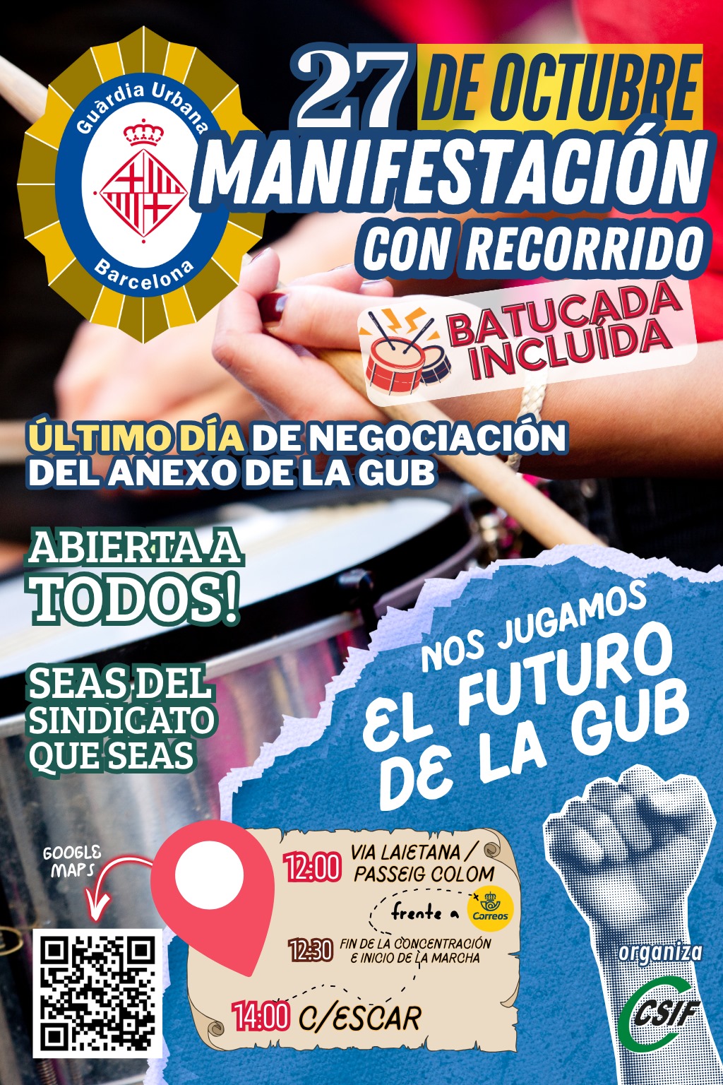 Barcelona, 24 de octubre de 2025. — La Central Sindical Independiente y de Funcionarios (CSIF) se concentrará el próximo lunes, 27 de octubre, para exigir al Ayuntamiento de Barcelona mejoras sociolaborales, económicas y profesionales para la Guardia Urbana de Barcelona (GUB).