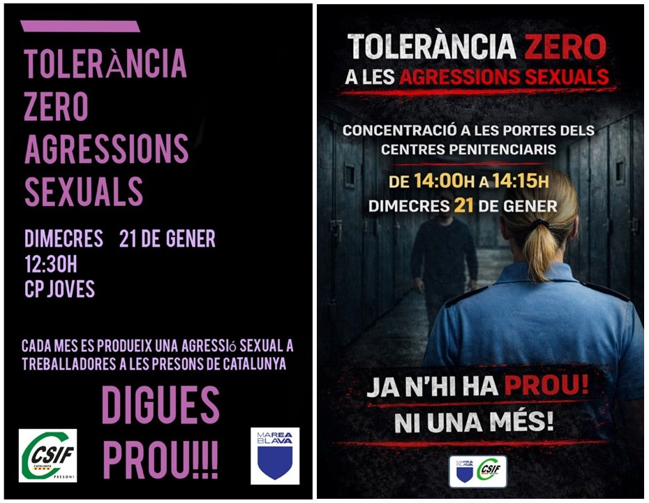 Barcelona, 20 enero de 2026.- La Central Sindical Independiente y de Funcionarios (CSIF), junto a la asociación Marea Blava, convocan una concentración mañana, miércoles 21 de enero, ante la última agresión sexual a una funcionaria, el viernes pasado, en el CP de Jóvenes, y para denunciar la grave falta de actuación de los responsables de la administración penitenciaria ante el incremento vertiginoso de las agresiones a los trabajadores y trabajadoras de prisiones.