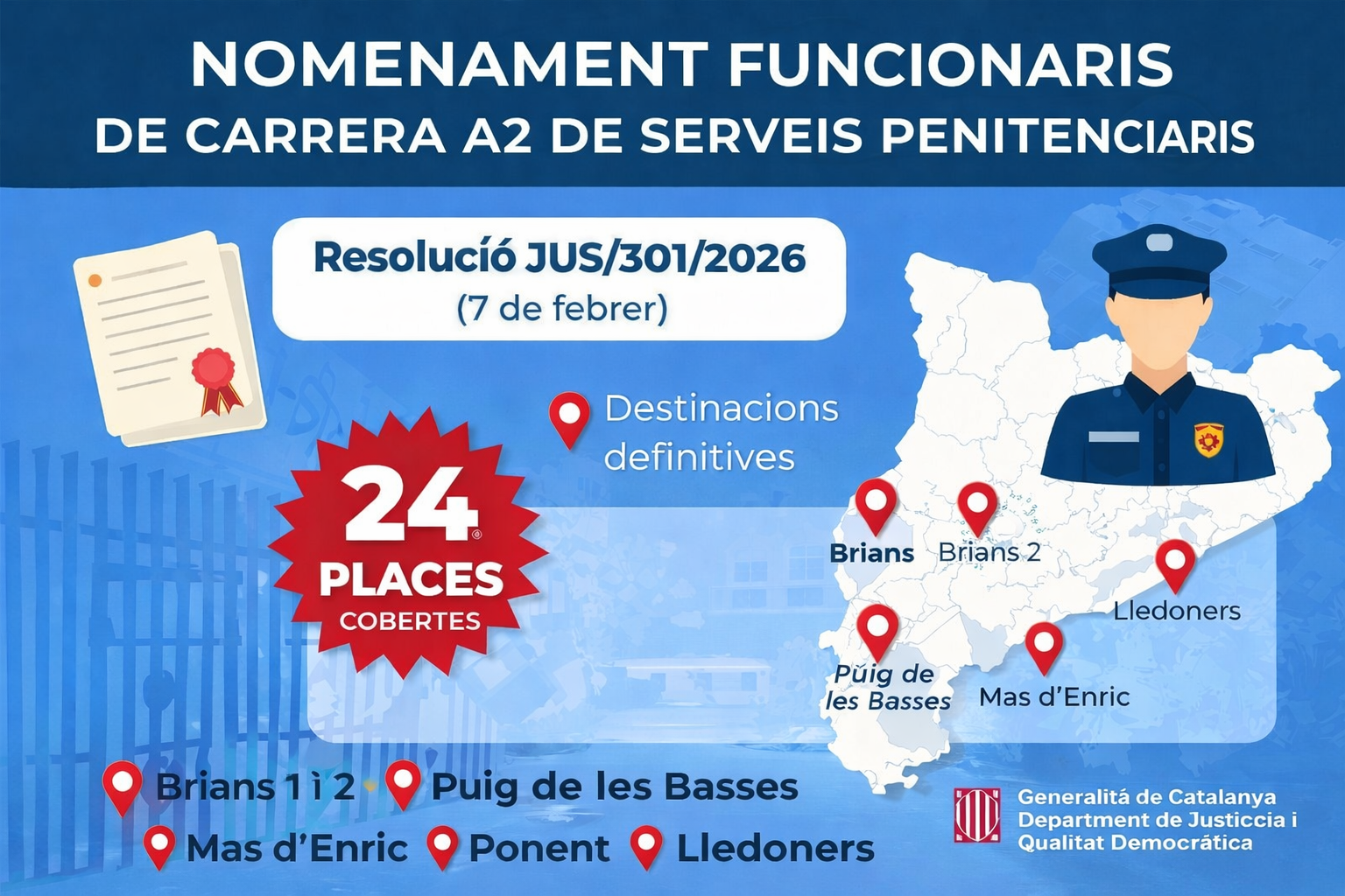 Ja s’ha publicat al DOGC la Resolució JUS/301/2026 (7 de febrer) amb el nomenament com a funcionàries de carrera del cos de diplomatura (A2) de serveis penitenciaris – convocatòria JU031 📄