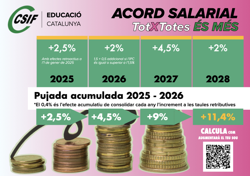 CSIF aconsegueix que el Govern aboni, finalment, la pujada del 2025 amb efectes retroactius i un increment salarial de l’11,4% fins al 2028, recuperant així un 2,9% de poder adquisitiu.