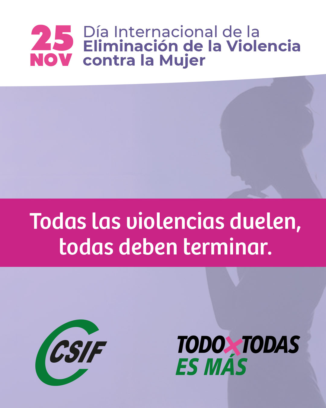 La Central Sindical Independiente y de Funcionarios (CSIF), sindicato más representa􀆟vo en las administraciones públicas y con presencia creciente en el sector privado, se suma al Día Internacional de la Eliminación de la Violencia contra la Mujer con el lema: “Todas las violencias duelen, todas deben terminar”.