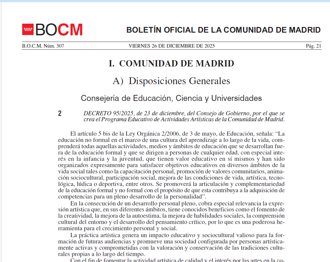 Programa educativo actividades artísticas – Decreto 95/2025, de 23 de diciembre, del Consejo de Gobierno, por el que se crea el Programa Educativo de Actividades Artísticas de la Comunidad de Madrid"