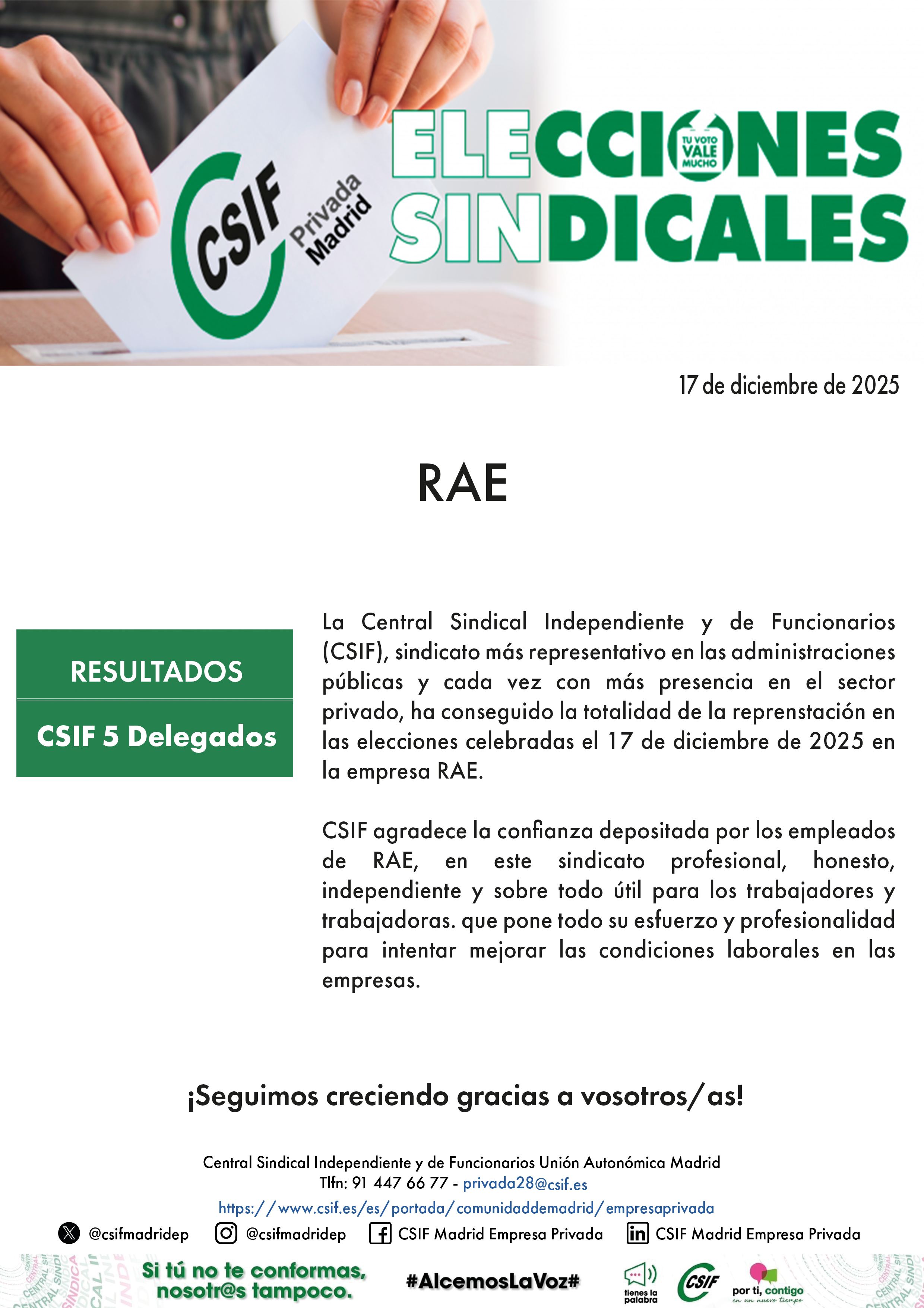 La Central Sindical Independiente y de Funcionarios (CSIF), sindicato más representativo en las administraciones públicas y cada vez con más presencia en el sector privado, ha conseguido la totalidad de la reprenstación en las elecciones celebradas el 17 de diciembre de 2025 en la empresa RAE.