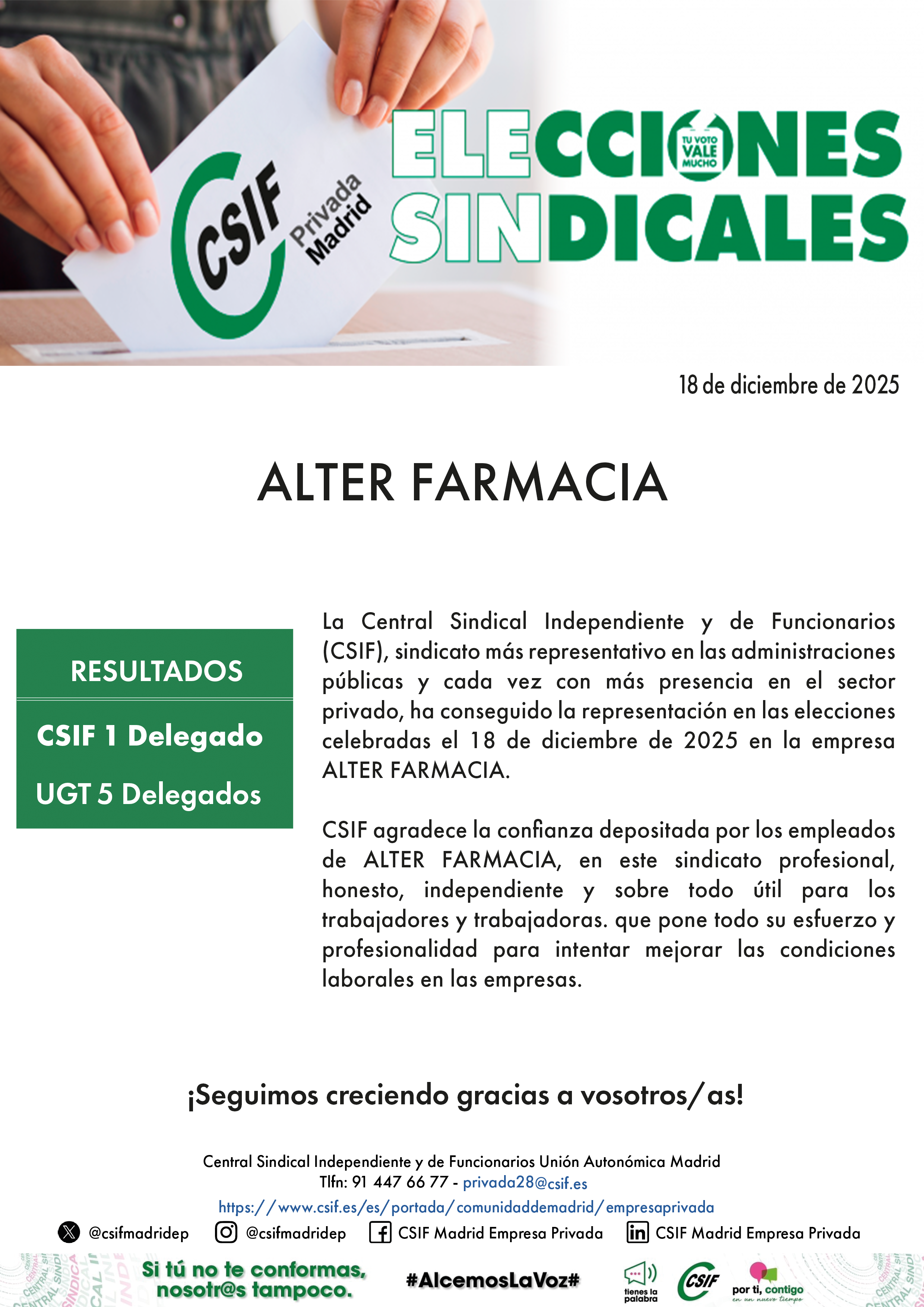 La Central Sindical Independiente y de Funcionarios (CSIF), sindicato más representativo en las administraciones públicas y cada vez con más presencia en el sector   privado, ha conseguido la representación en las elecciones celebradas el 18 de diciembre de 2025 en la empresa ALTER FARMACIA.
