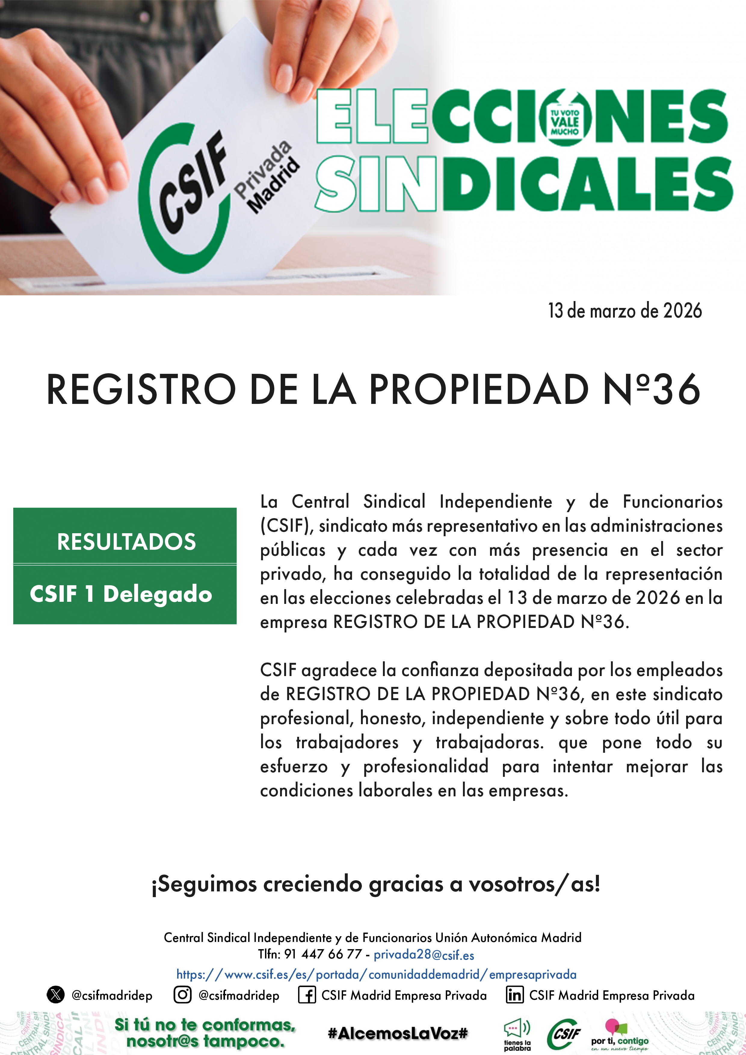 La Central Sindical Independiente y de Funcionarios (CSIF), sindicato más representativo en las administraciones públicas y cada vez con más presencia en el sector privado, ha conseguido la totalidad de la reprenstación en las elecciones celebradas el 3 de diciembre de 2025 en la empresa Registro de la Propiedad nº36