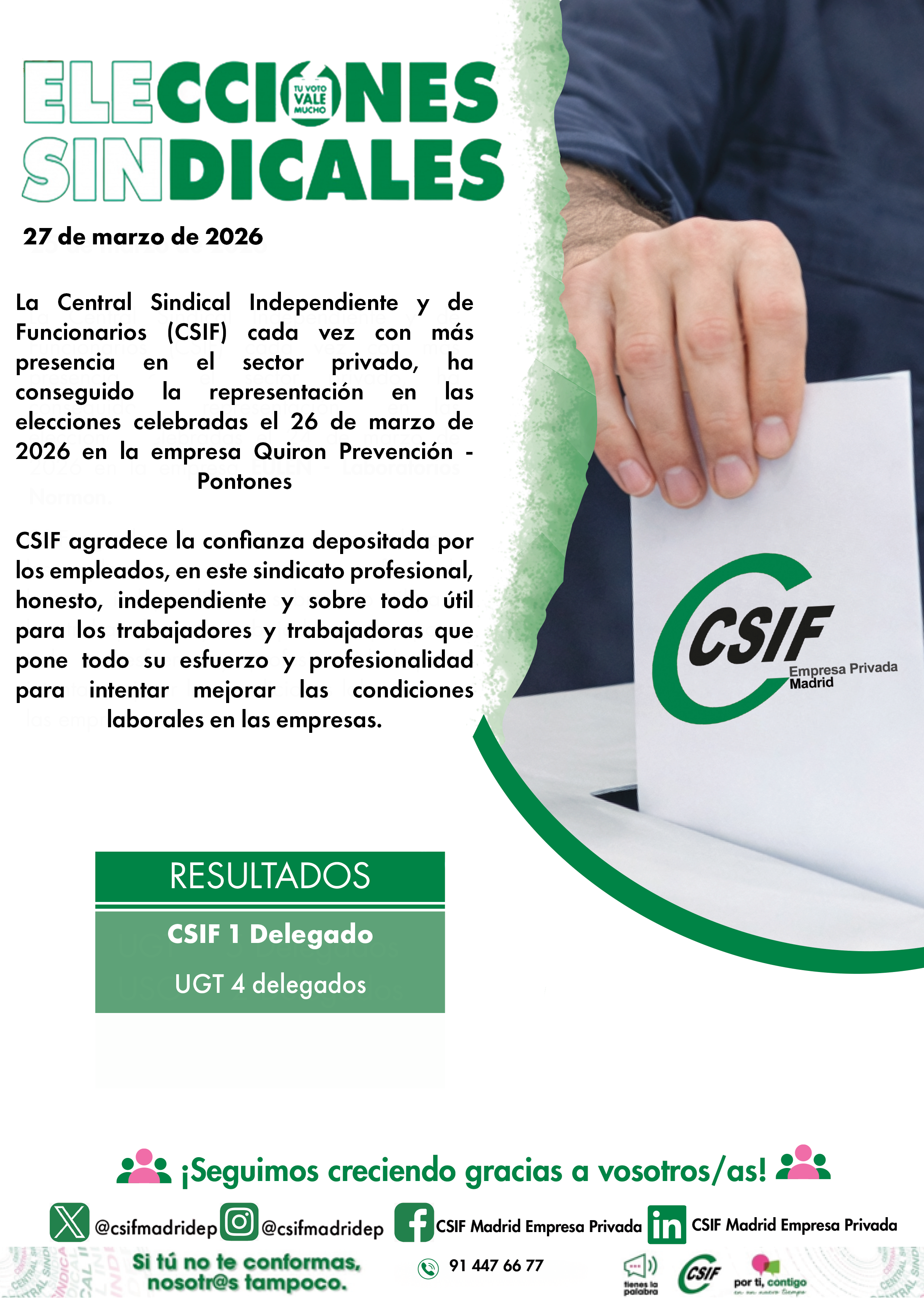 ha conseguido la representación en las elecciones celebradas el 26 de marzo de 2026 en la empresa Quiron Prevención - Pontones.